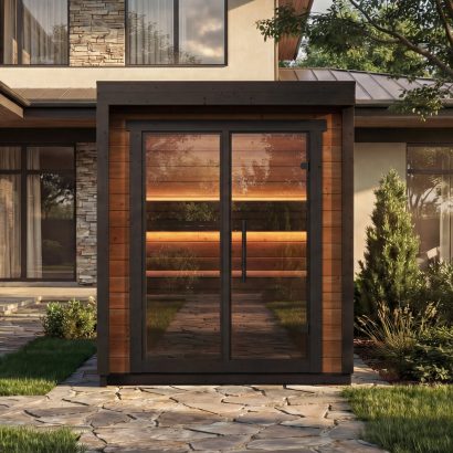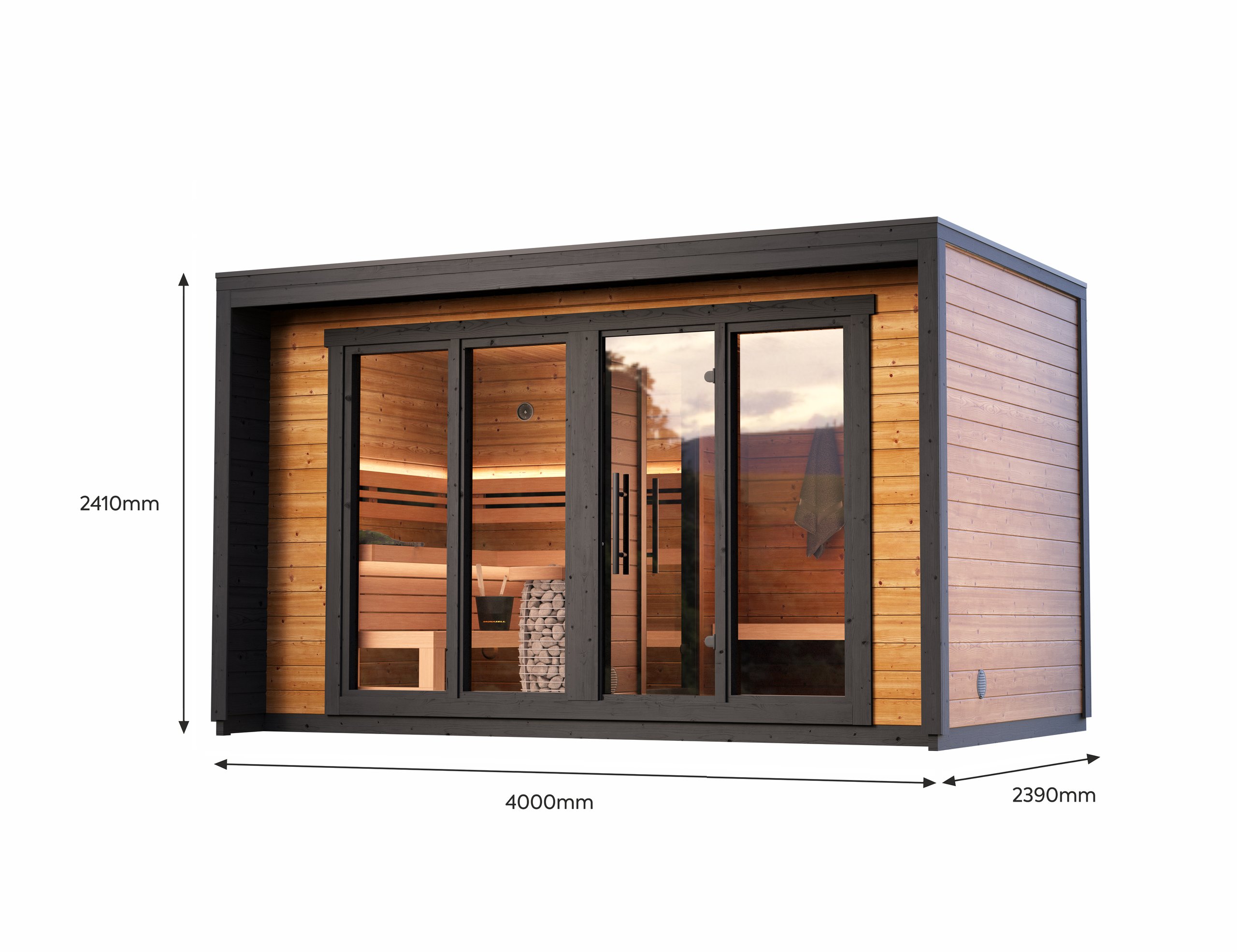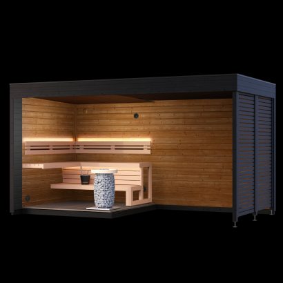 Patio L er með stóru fordyri/setustofu og er í málunum 4,0m x 2,39m x 2,41. Tilvalið er að nota fremra rýmið til fataskipta og afslöppunnar milli þess sem hitinn fær að leika um líkamann í saununni.
