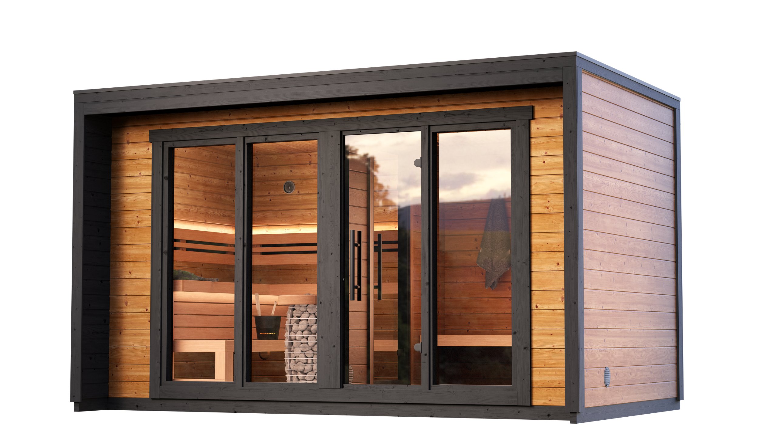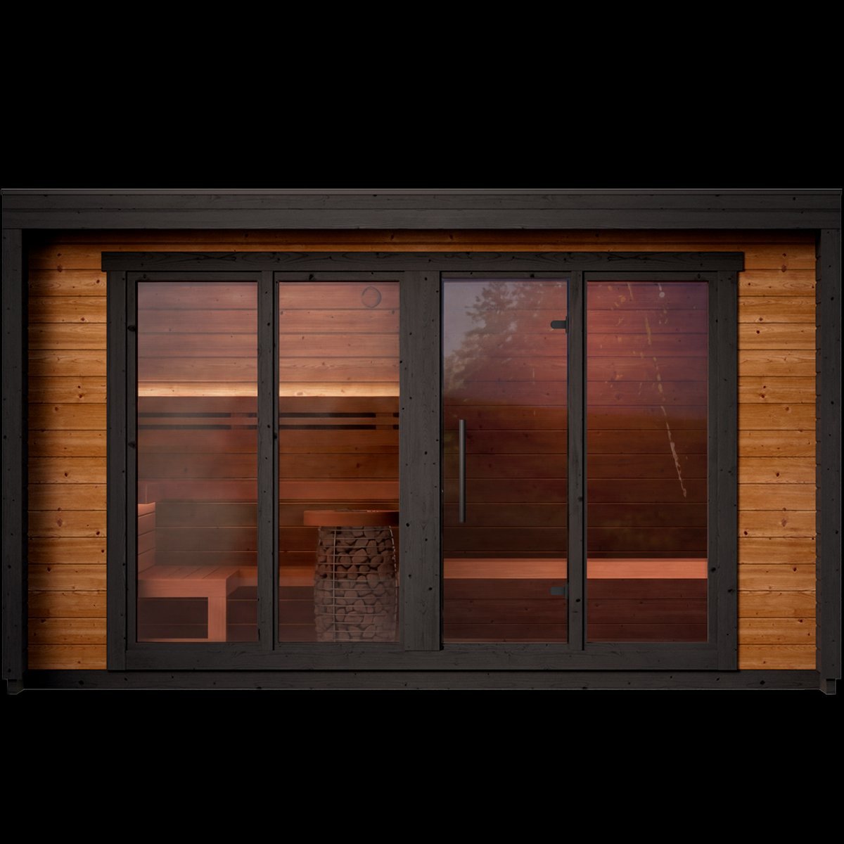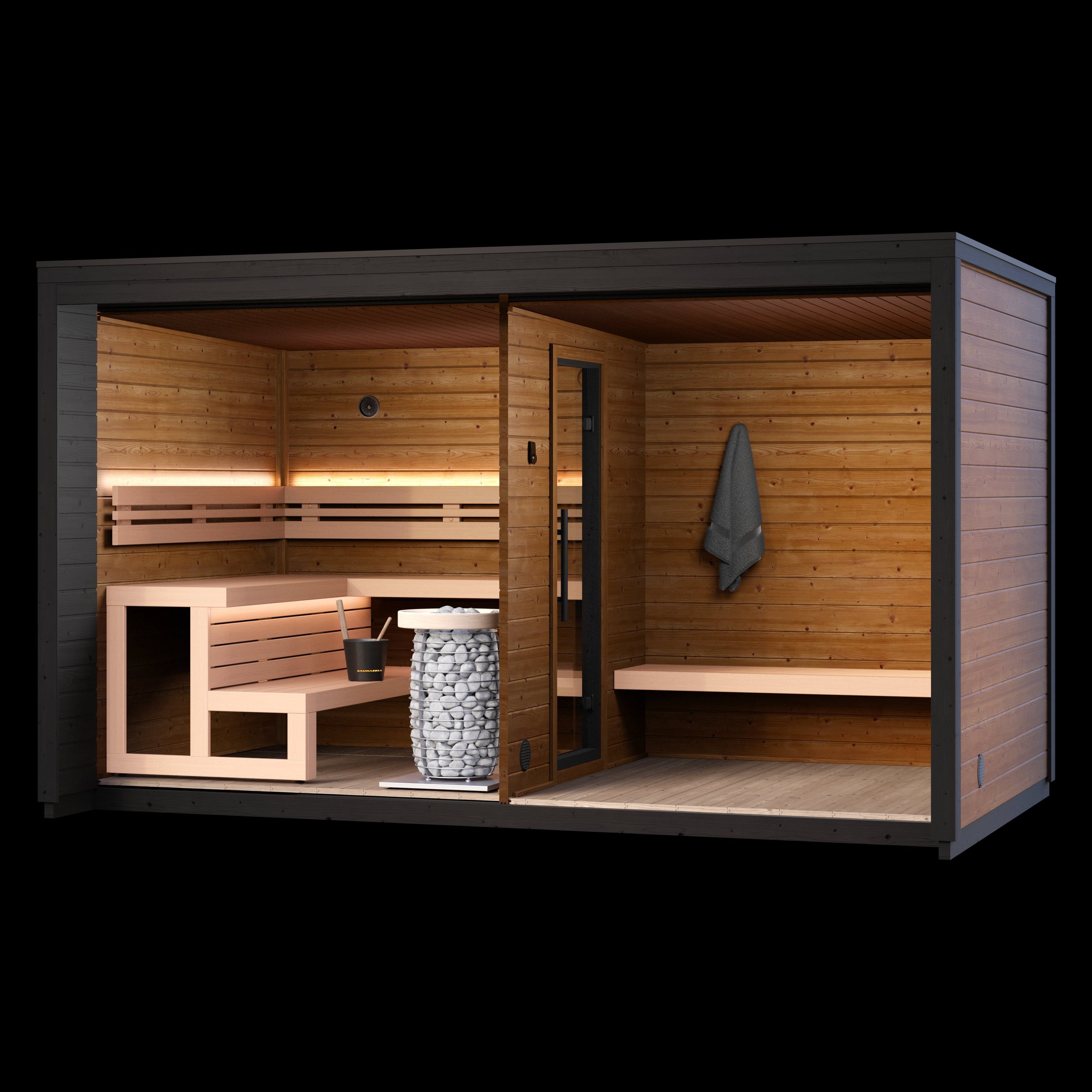 Hún er byggð úr 40mm Thermowood bjálkum og er með hertu gleri í gluggum og hurð að framanverðu. 30mm PIR sauna einangrun er í þakinu og þakdúkur að utanverðu. Svartir karmar og málmflasningar í þakköntum. Bekkir eru úr hágæða ölri (alder).