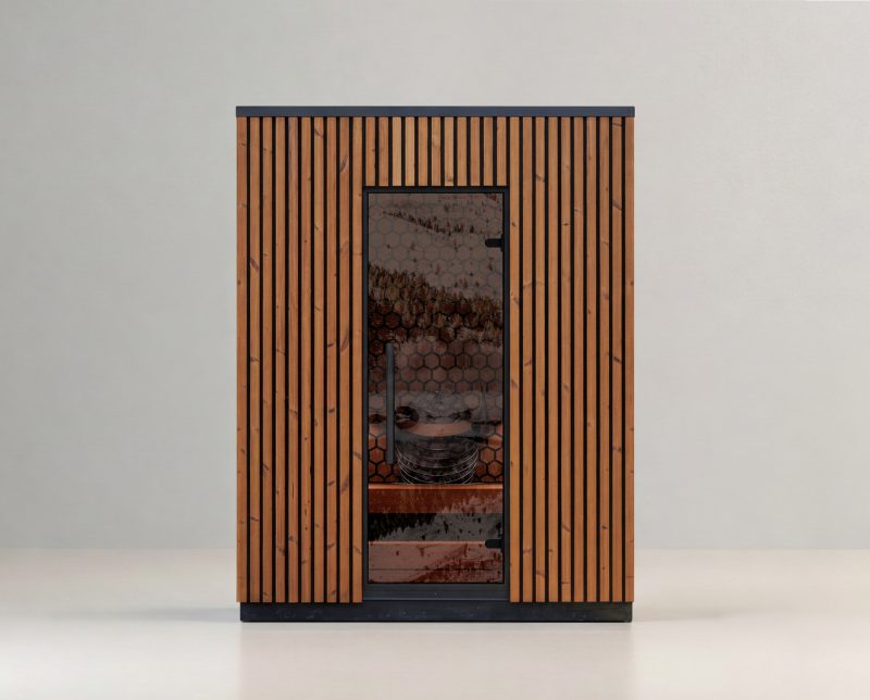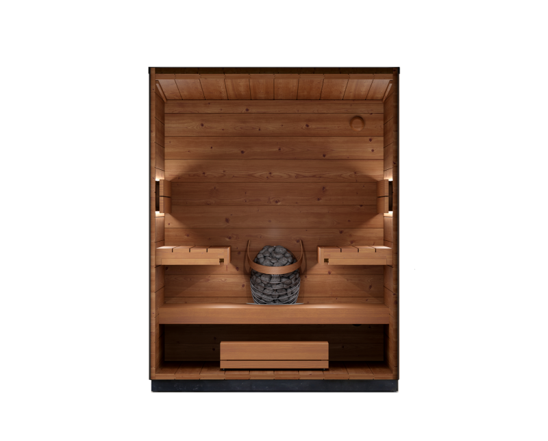 Sauna fyrir allt að fjóra. Í þessari sauna er setið andspænis hvort öðru, sem bíður upp á gott spjall augliti til auglitis þegar farið er saman í sauna.Ofninn er felldur inn í bakvegginn fyrir örugga og plásssparandi hönnun sem heldur setsvæðinu opnu.