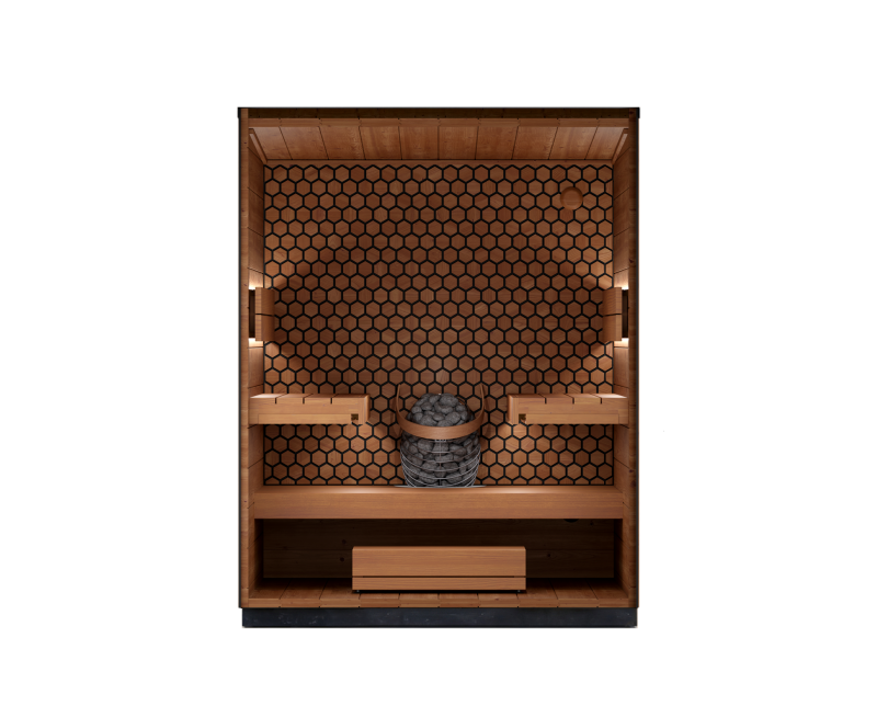 Sauna for four people. The face-to-face bench layout invites conversation and balanced leil. The heater is set into the back wall for a safe, space-saving design that keeps the seating area open.