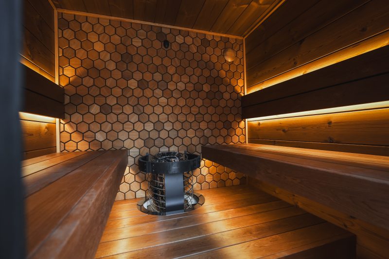 Að innan snýst allt um þægindi og endingu. Bekkir, bakstoðir, loft og veggir eru úr 100% Thermowood – valið fyrir gæði og mikið og gott hitaþol.
